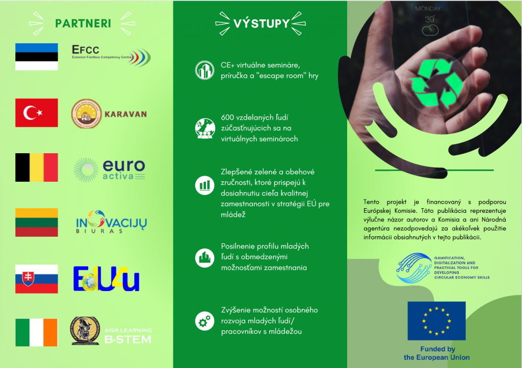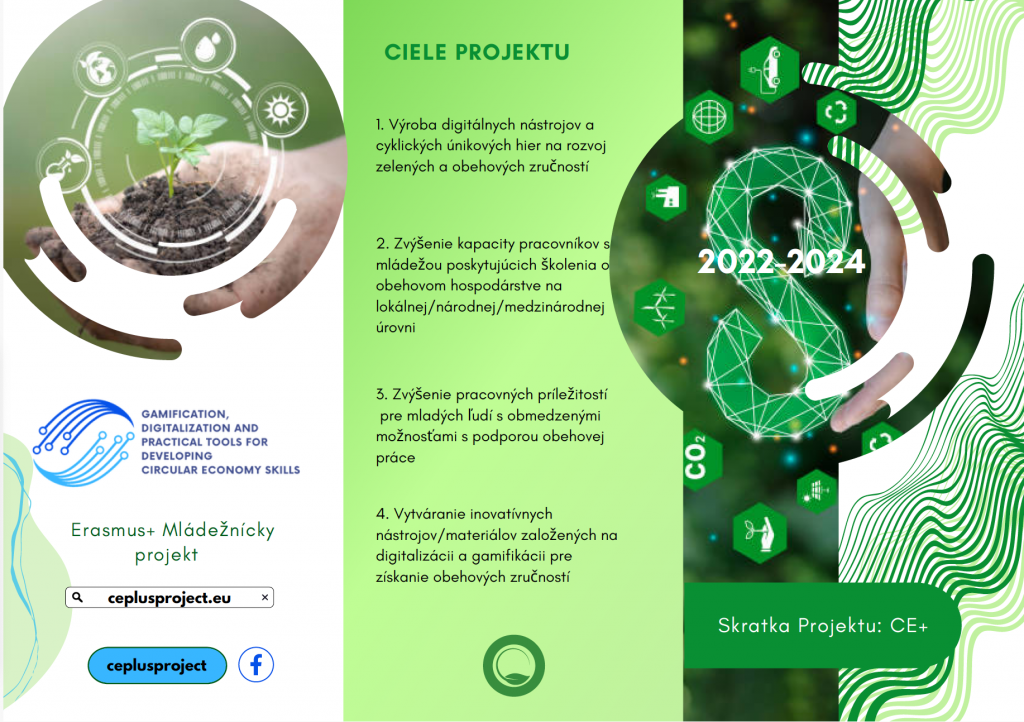 Projekt Erasmus+ „Gamifikácia, digitalizácia a praktické nástroje na rozvoj zručností v obehovej ekonomike“ (CE+) sa zameriava na poskytovanie sektorových pracovných zručností prostredníctvom aktivít neformálneho vzdelávania, najmä pre mladých ľudí s obmedzenými príležitosťami (NEET, mládež z radov migrantov atď.), s cieľom znížiť nezamestnanosť mladých ľudí. Projekt sa zaoberá kritickou potrebou vybaviť mládež, pracovníkov s mládežou a podniky zelenými a obehovými zručnosťami, ktoré sú nevyhnutné pre prechod na udržateľné hospodárstvo.