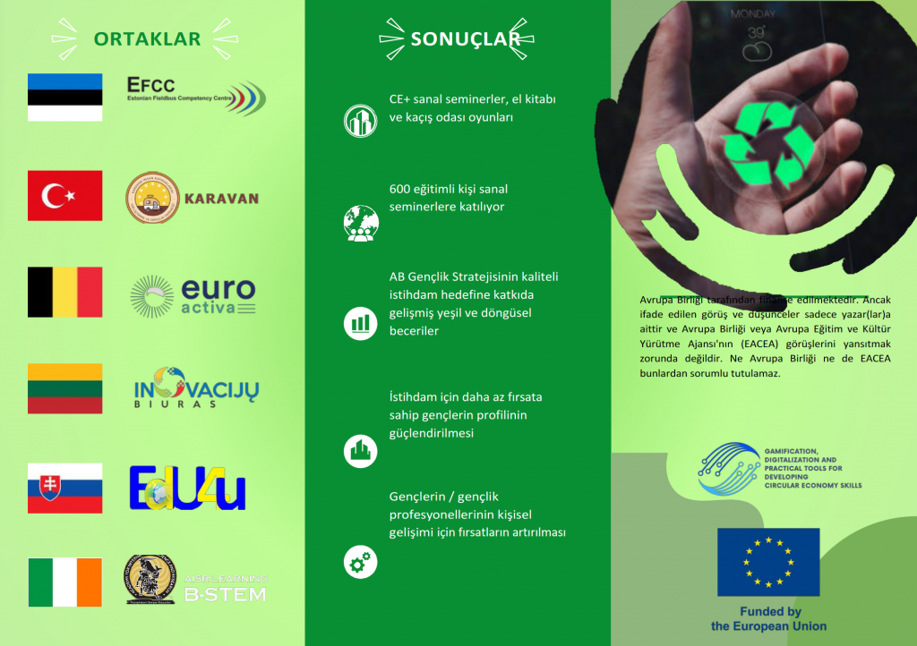 Erasmus+ projesi “Dairesel Ekonomi Becerilerini Geliştirmek İçin Oyunlaştırma, Dijitalleştirme ve Pratik Araçlar” (CE+), özellikle daha az fırsata sahip gençler (NEET’ler, göçmen gençler, vb.) için resmi olmayan öğrenme faaliyetleri yoluyla sektörel istihdam becerileri sağlamaya odaklanarak genç işsizliğini azaltır. Proje, gençleri, gençlik çalışanlarını ve işletmeleri sürdürülebilir bir ekonomiye geçiş için gerekli olan yeşil ve dairesel becerilerle donatma konusunda kritik bir ihtiyaca hitap eder.